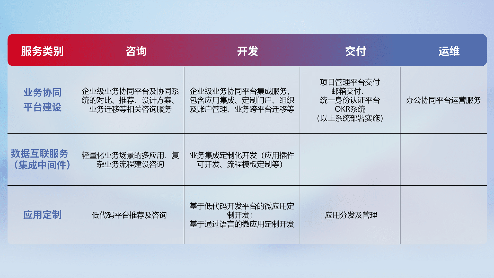 针对钉钉、、、企微、、IDaas等平台级产品提供产品的规划、、、、方案、、、、交付、、、定制化开发等服务,,,,实现如统一协同办公、、、智能客户服务、、混合会议管理、、智能数据查询、、等业务场景,,,实现数字化转型。。。。