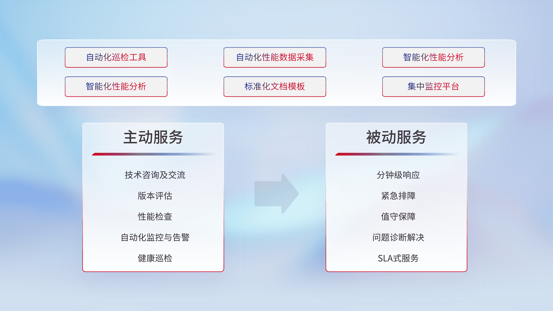 智能化工具和标准化文档,,,,保障服务质量,,,提供主动服务(包含技术咨询、、、版本评估、、性能检查、、、、自动化监控与告警、、、健康巡检)和被动服务包含(分钟级响应、、紧急排障、、、值守保障、、、、问题诊断解决、、、SLA服务)。。。。